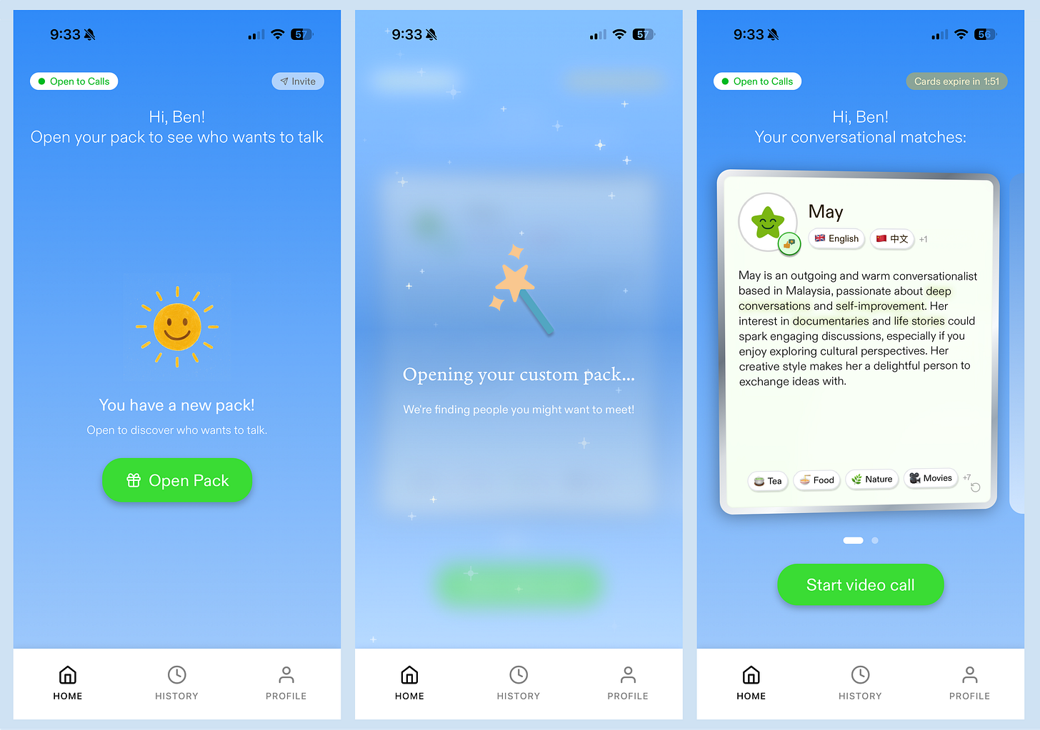 Another interesting feature is how you connect with others. Since it’s not a social network, there’s no friending or following. You open up a “card pack” and it reveals matches that are available to talk.