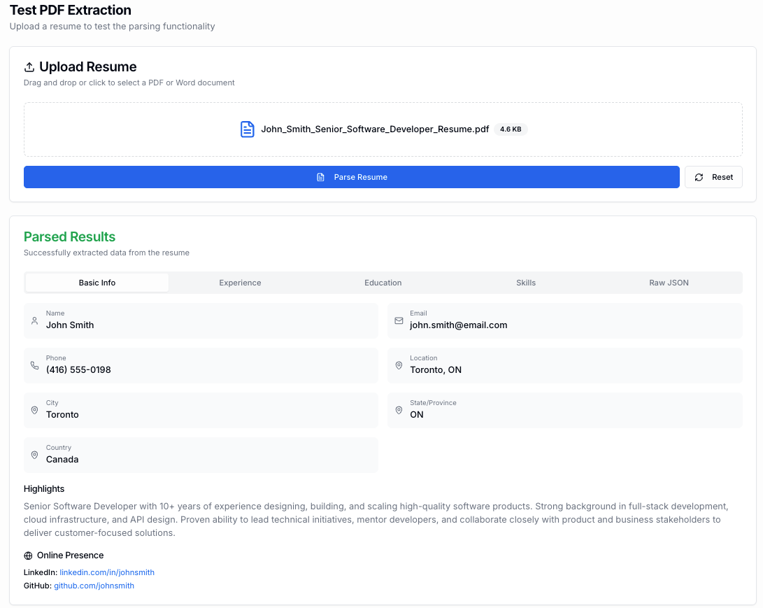 So I built a Test PDF Extraction tool into the ATS. This made it a lot simpler to test this feature than constantly applying for jobs.