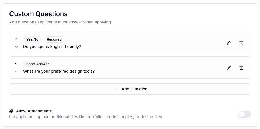 After setting up the basic ATS, I wanted to add a new application feature: custom questions. These are questions that can be created per job posting to ask applicants specific things. Lovable built a Custom Questions feature very easily, although I knew there were a couple issues to think about, including: What happens if the custom questions are changed or deleted after applicants have responded? (Note: Backwards data compatibility is always a huge issue). I decided on the appropriate rules for that and implemented the feature.