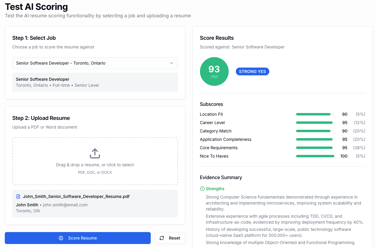 The Test AI Scoring feature is an admin capability that allows me to constantly test how AI scoring is working. To be honest, any time I make a meaningful change to the ATS, I should probably have a bunch of resumes and jobs setup to run the tests automatically. Right now it’s manual, which is super tedious and high-risk.
