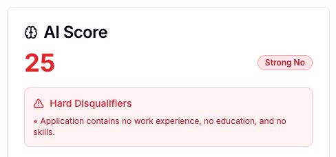 I decided to add an AI Resume Scoring feature to the ATS. Seems useful and our current ATS doesn’t have it. I worked with Lovable to build it and started testing resumes quickly. Instead of testing great resumes, I tested bad ones, because a big reason for AI scoring is to filter out applicants. Testing good resumes and getting good scores is the happy path—feels good, but isn’t thorough enough to know if AI Resume Scoring is doing its job.