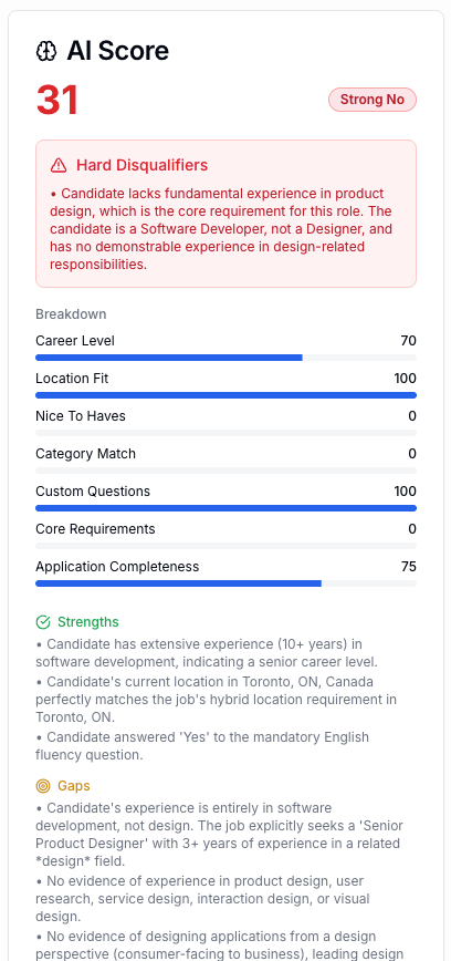 Using two jobs (Senior Product Designer and Senior Software Developer) I started applying with very weak resumes. It would spit out scores, and then I’d have to decipher what the AI was doing. In one case it was scoring a near-empty resume (with junk inputs) higher than a better resume. Why? It turns out the AI was over-indexing on location. The junk resume was based in Toronto (same as the job), and the better, but still lousy, resume was in Vancouver. This took a lot of back and forth with Lovable to understand, as we worked to fine-tune the weighting.