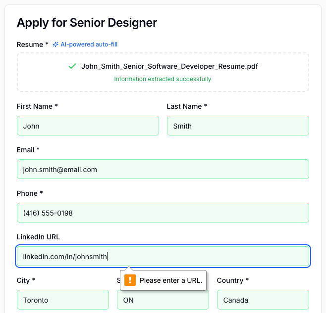 The PDF parser worked, but in his resume, the LinkedIn URL doesn’t have “https://” in front of it. So the system throws an error. That’s annoying. I can’t guarantee that people’s resumes have a “properly formatted” LinkedIn profile URL. So I either have to allow the system to accept the URL formatted without https:// or have the system format the URL automatically (which can lead to other issues). That’s a simple error / edge case issue in a relatively simple product. To build and launch a good product, you have to test everything and think through all the potential issues, including formatting, conditionals and more.